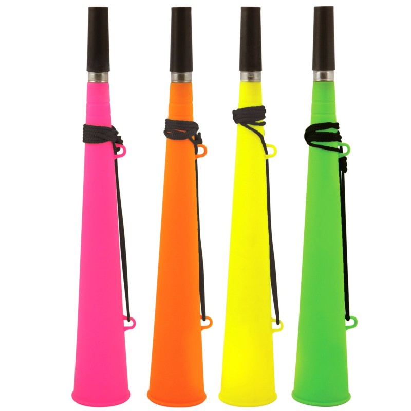 De toeters worden geleverd in 4 verschillende felle neonkleuren, die willekeurig door elkaar worden geleverd.