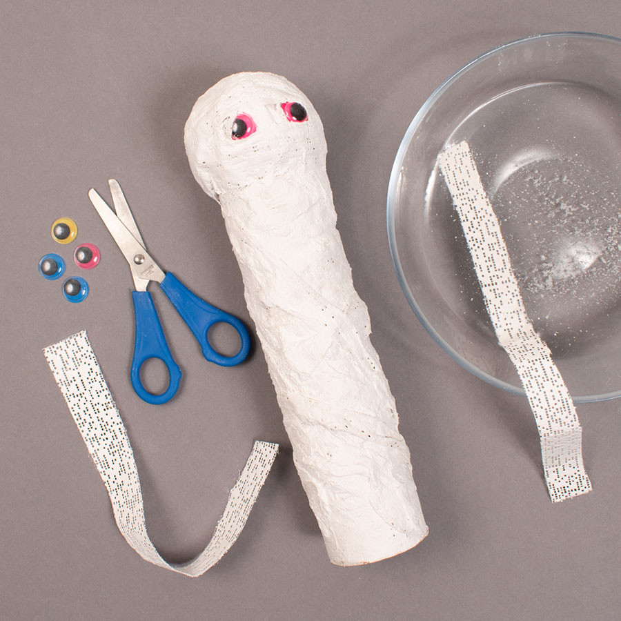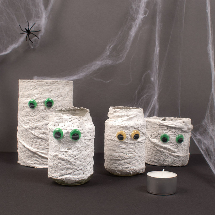 En klaar zijn je mummies. Hang er wat spinnenrag omheen voor een extra spooky effect.