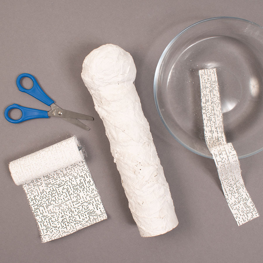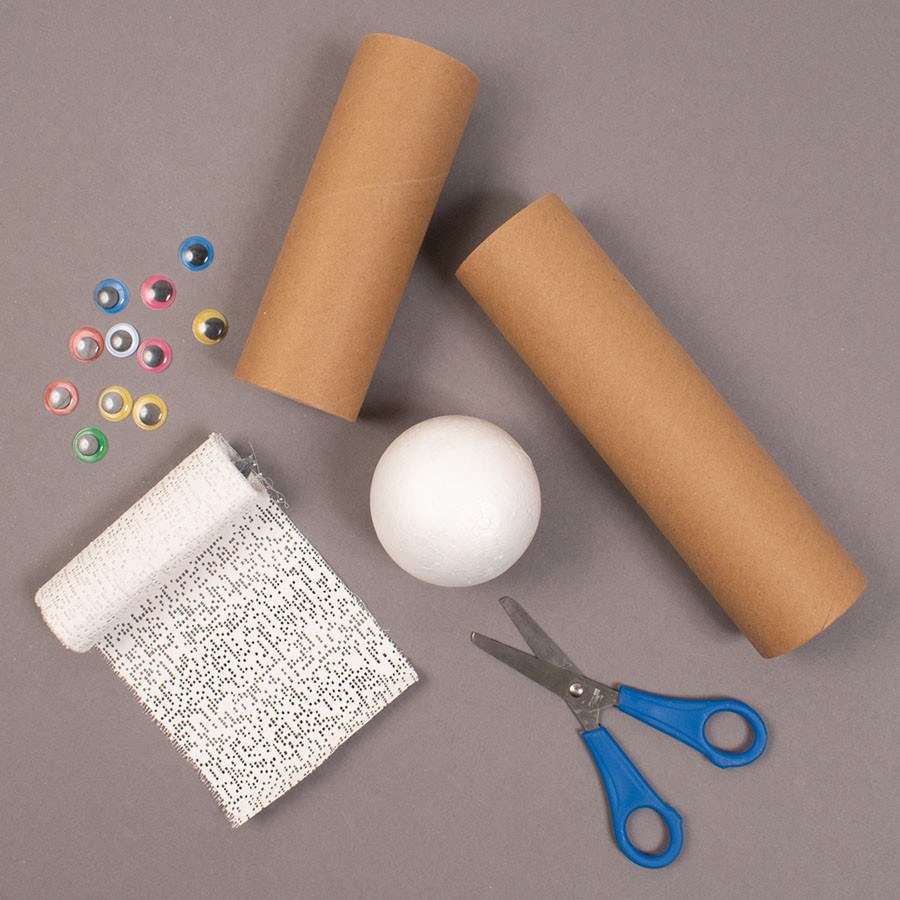 Leg alles klaar, wc rolletjes (of glazen potjes), gipsverband, foamballen, oogjes en een schaar.