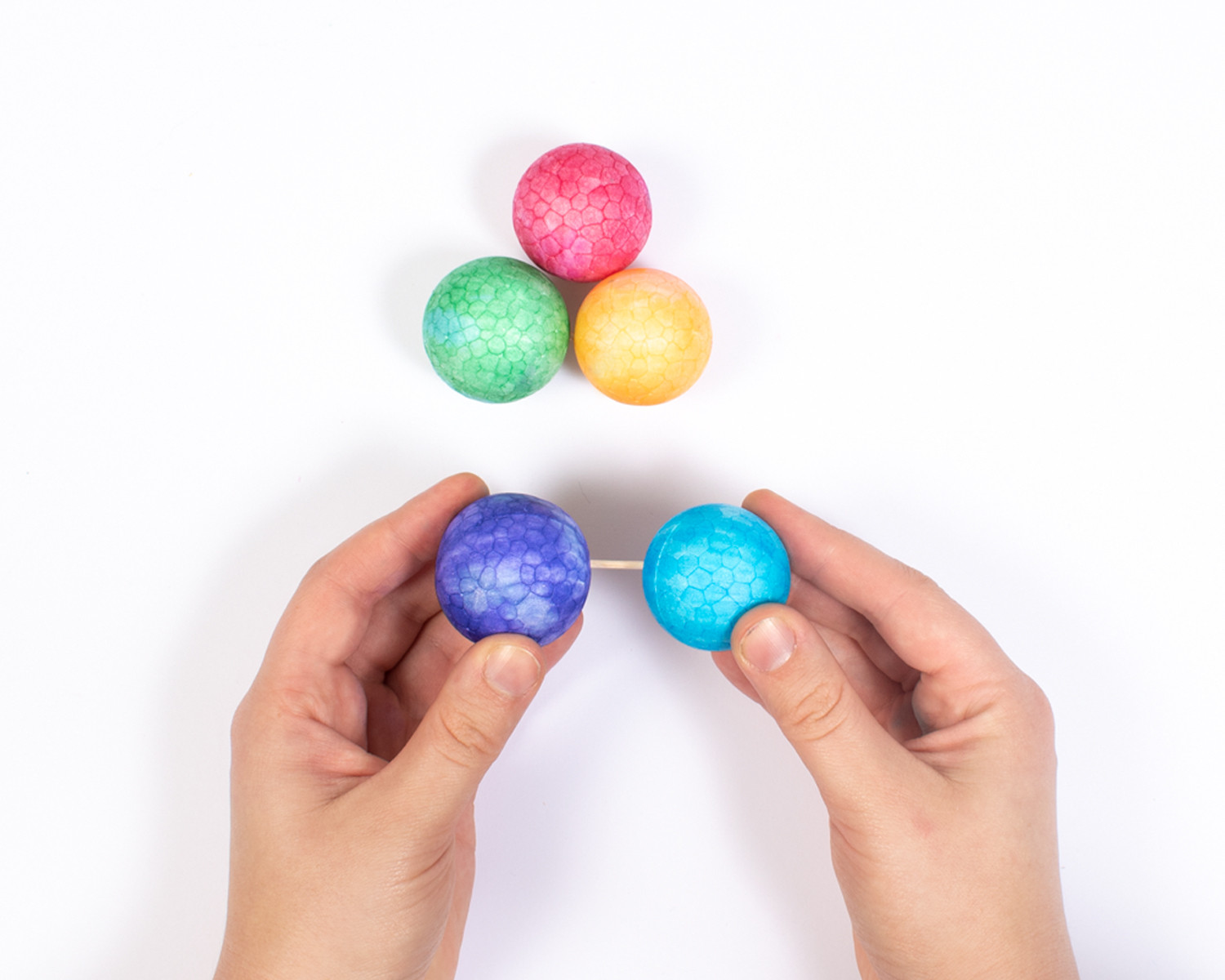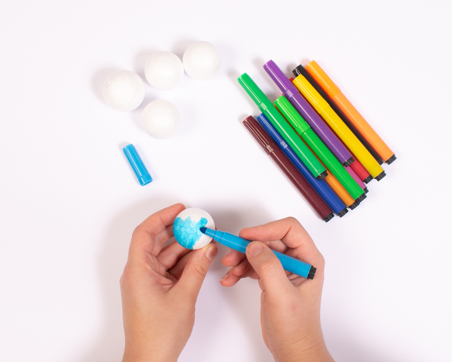 Neem 5 foam (styropor) balletjes groot of klein. Schilder of kleur deze in een vrolijke kleur.