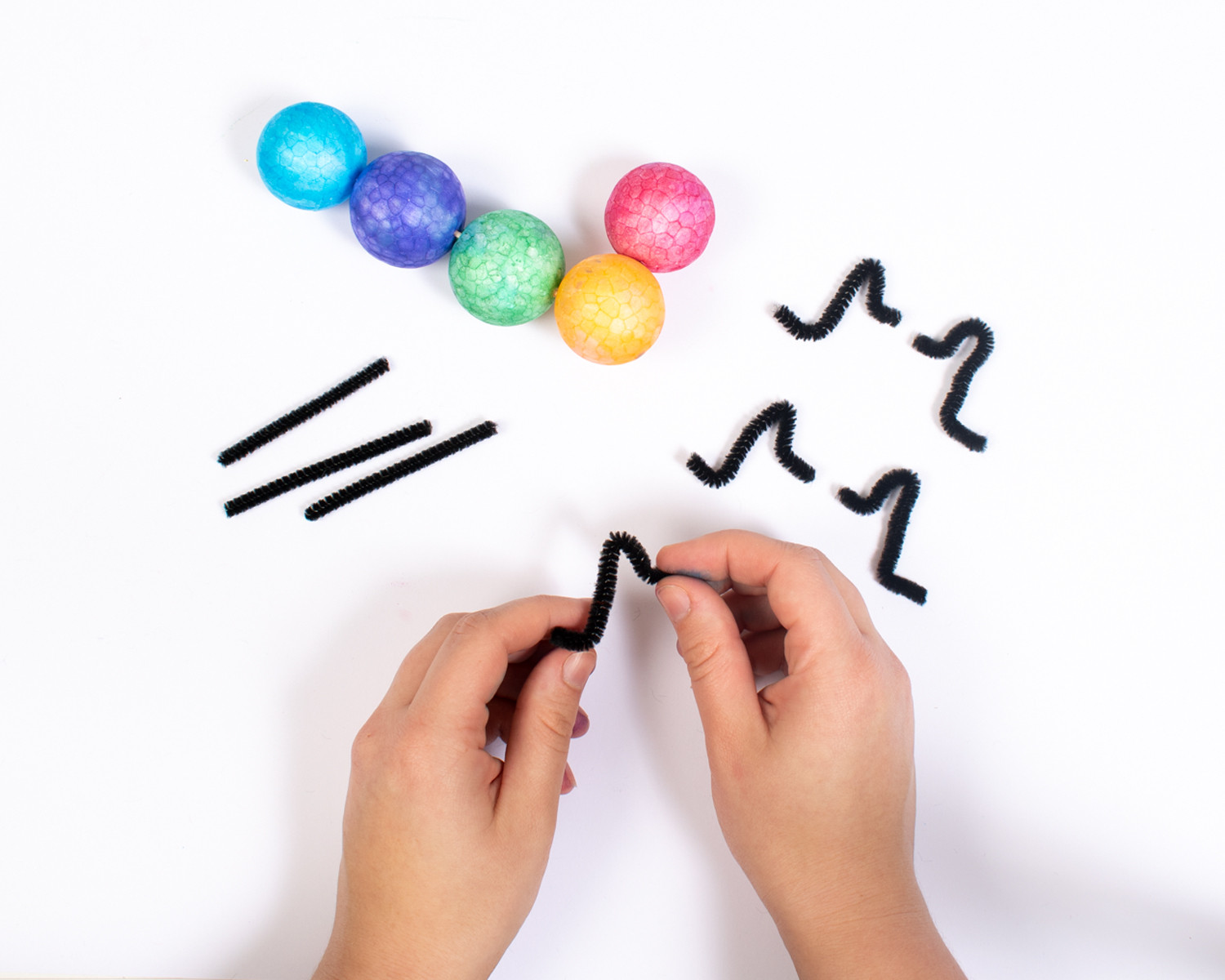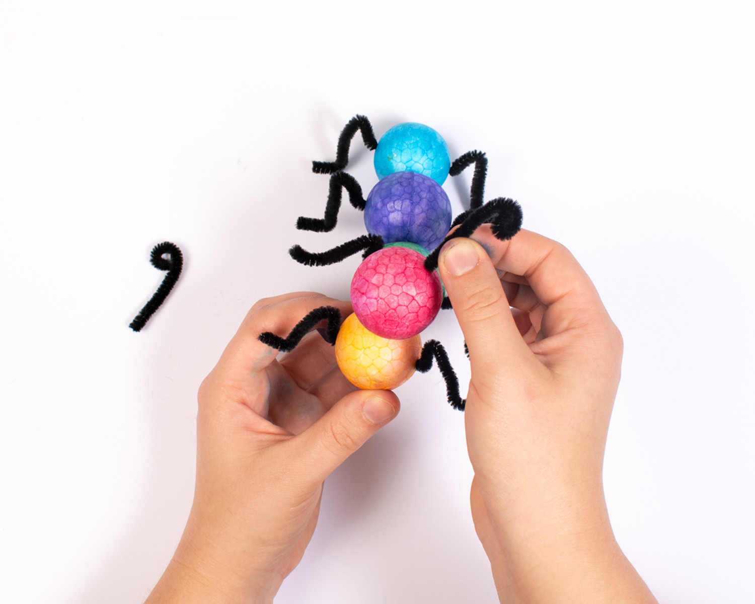Knip nu 8 stukjes chenille draad en buig deze in een hoek om pootjes van te maken.