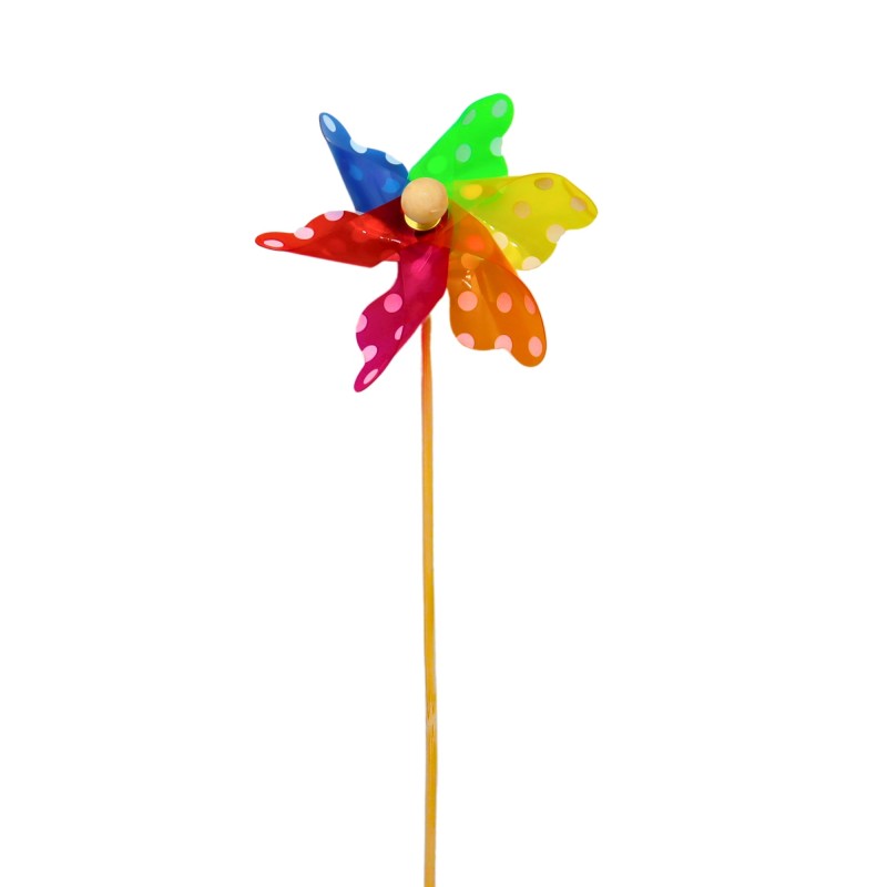 Vrolijk gekleurde kunststof windmolen op een houten steel.