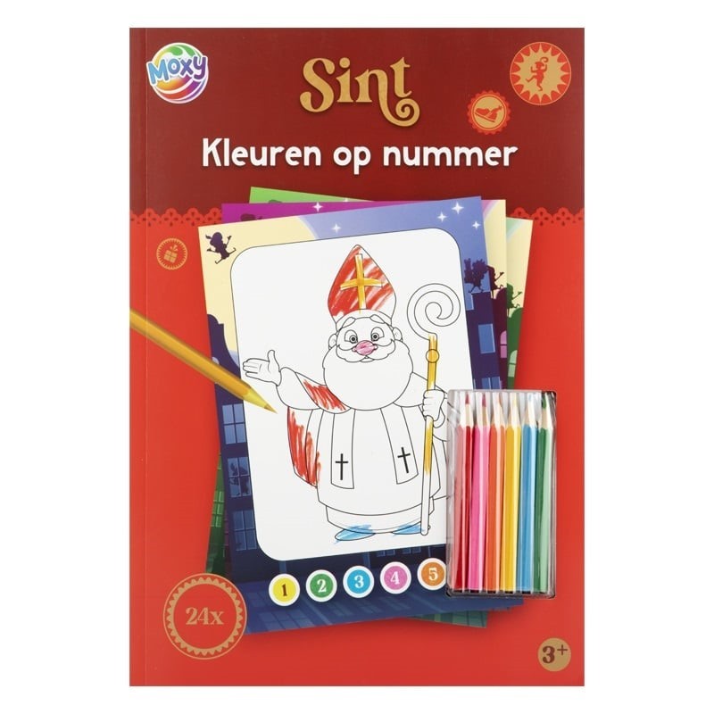 Super kleurboek met 24 mooie Sint en Piet kleurplaten die via de nummers in te kleuren zijn.