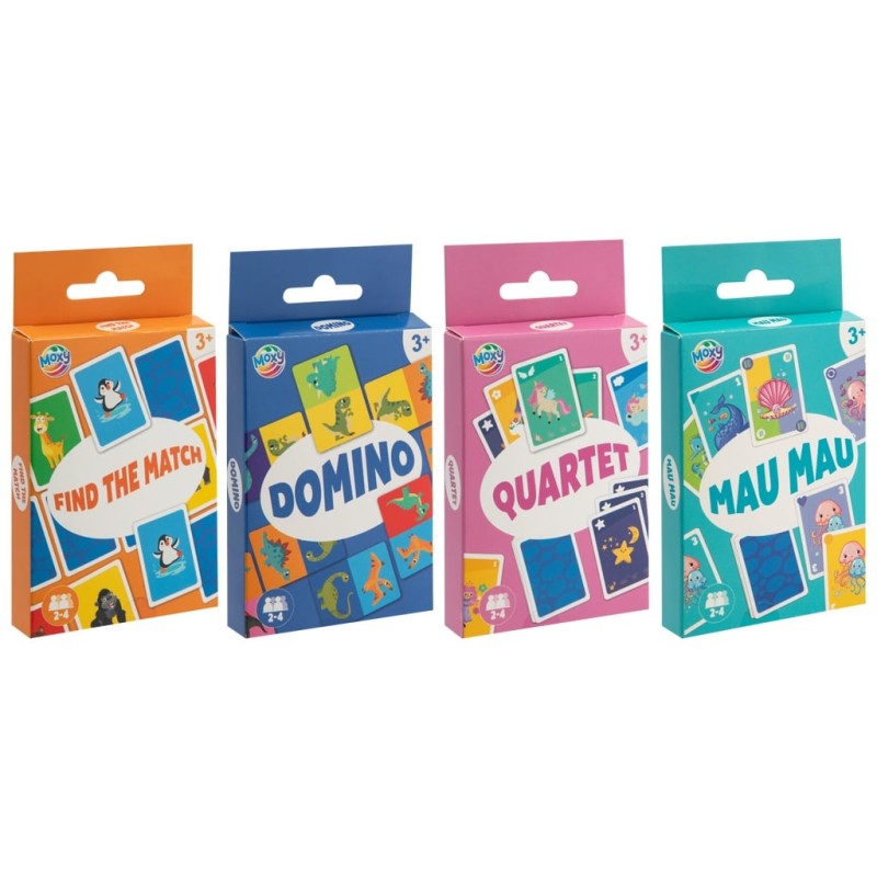 4 verschillende uitvoeringen: kwartet, domino, memory en mau mau (raak zo snel mogelijk al je kaarten kwijt) worden door elkaar geleverd.