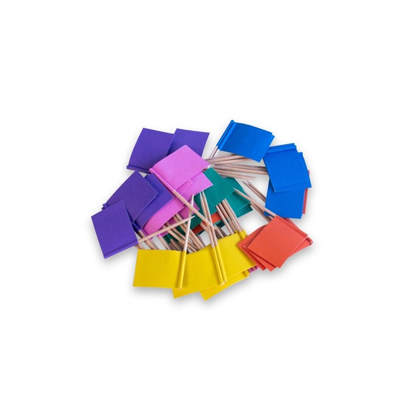 Prikkertjes met vlaggetjes in verschillende kleuren. Leuk voor in hapjes. Prikkertje is van hout en het vlaggetje is van papier. Het prikkertje heeft een hoogte van 6,5cm en zit verpakt per 48 stuks